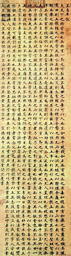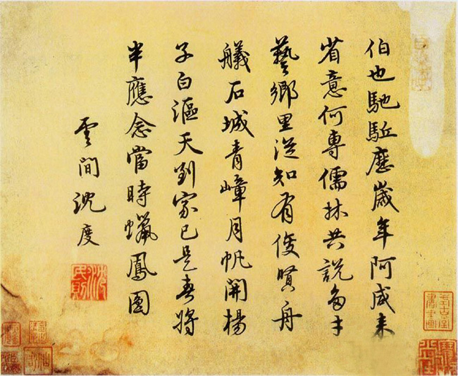 沈度,1357年生,1434年逝世,松江华亭(今上海松江)人。 明代书法家。字民则,号自乐。与弟沈粲皆擅长书法,藏于秘府,被称为“馆阁体”,天下竞相模仿。他善篆、隶、真、行、八分书。他的楷书写得工整匀体,平正圆润,朱棣(明成祖)十分喜欢和推崇,甚至夸他是“我朝王羲之”。沈度的楷书是以晋唐小楷和唐虞永兴《庙堂碑》为基础,加以发挥而成。董其昌对沈度颇推崇,称“文(征明)、祝(允明)二家,一时之标,然欲突过二沈未能也。”《敬斋箴册》,沈度书于永乐十六年(1418),时年61岁。此卷系楷书黄纸本墨迹。纵向有直界格。纵23.8厘米,横49.4厘米。文凡19行,行10字。现藏北京故宫博物院。此幅楷书为横卷,书写一笔不苟,法度谨严,点画巧妙,转折分明,提按清楚,运笔便捷利落而沉实;线条轻重,粗细有变化,其收笔、落笔、撇捺、转折勾挑处,既有法度,又不刻意做作,字中牵丝搭笔,显得十分自然。结构以方正为主,各部停匀,属于楷体,颇具晋唐古法,又有子昂笔意,唯更加甜熟,遂为馆阁之滥觞。正如王文治所谓“端雅正宜书制诰,至今馆阁有专门”。